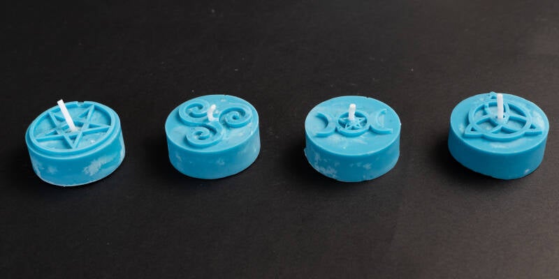 Chaque flamme porte une intention, certaines sont ornées de symboles puissants (pentacle, triqueta, œil, phases lunaires…), d’autres sont unies, laissant place à la magie des couleurs.